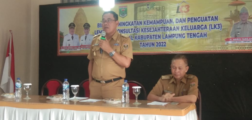 Infogeh.co, Lampung Tengah – Bupati Lampung Tengah yang di wakili Asisten Pemerintahan dan Kesra Adi Sriyono, S.Sos., MM. membuka acara Penguatan Kemampuan SDM dan Penguatan Lembaga Konsultasi Kesejahteraan keluarga (LK3 ) pada bidang pemberdayaan sosial, (11/10/2022).