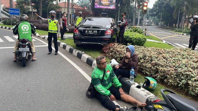 Akun resmi @TMCPoldaMetro menggugah informasi soal kecelakaan yang terjadi di depan restoran Batik Kuring tersebut sekitar pukul 07.36 WIB. Tampak sedan Mercy keluar jalur dan masuk taman yang berada di pinggir jalan.