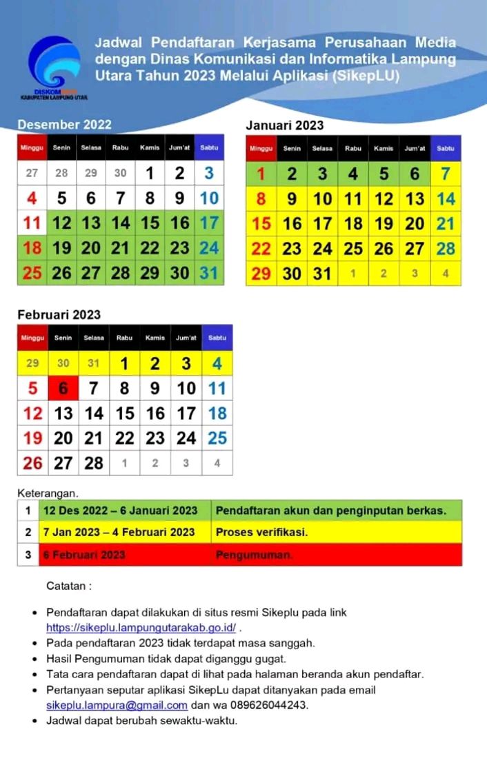 Kepala Dinas Komunikasi dan Informatika (Diskominfo) Lampung Utara, Doni Ferwari Fahmi, SE, MM, mengatakan, pendaftaran secara resmi mulai dibuka, Senin 12 Desember 2022. Tahapannya dimulai dari pendaftaran akun dan penginputan berkas 12 Desember 2022 – 06 Januari 2023.