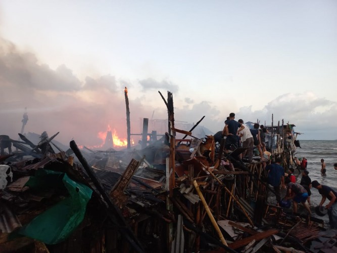 Warga ramai membantu memadamkan kobaran api dengan menggunakan alat seadanya seperti ember dan mengambil air dari laut.