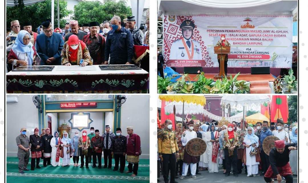 Infogeh.co, Bandar Lampung – Walikota Bandar Lampung, Hj. Eva Dwiana Menghadiri Peresmian Pembangunan Masjid Jami’ Al- Ishlah, Sesat Adat / Balai Adat, Gapura Agung Tiuh Kedamaian Marga Balaw Bandar Lampung oleh Penyimbang Tuha Raja Masyarakat Adat Tiuh Marga Balaw, Jum’at (24/06/2022).