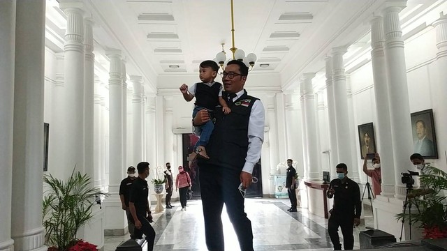 Emil datang dengan menggunakan kemeja putih yang dibalut rompi warna hijau. Terlihat pula, dia datang dengan memangku anak angkatnya yang berusia 2 tahun, yakni Arkana Aidan Misbach atau dikenal Arka. Informasi yang dihimpun, Emil bakal mengikuti rapat pimpinan di Gedung Sate.