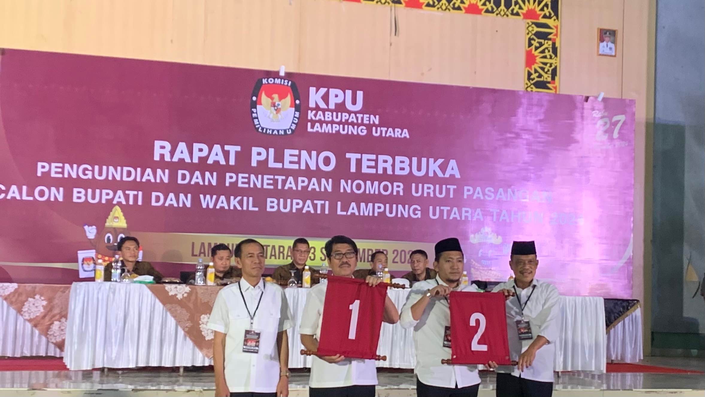 Infogeh.co, Lampung Utara – Proses pengundian nomor urut pasangan calon Bupati dan Wakil Bupati Lampung Utara berlangsung dengan tertib dan aman, di Islamic Center Kotabumi pada Rabu (21/9/2024). Dalam pengundian tersebut, pasangan Hamartoni-Romli memperoleh nomor urut 1, yang mereka sebut sebagai simbol kemenangan.