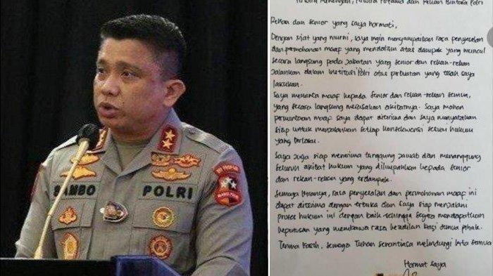“Perihal: Permohonan maaf kepada senior dan rekan perwira tinggi, perwira menengah, perwira pertama dan rekan bintara Polri,” tulis Sambo dalam surat itu.