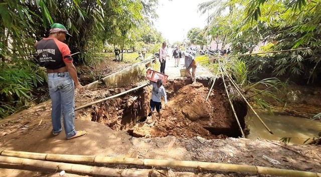 infogeh.co, Lampung Selatan – Hujan deras sejak Kamis (6/10) hingga Jumat (7/10) pagi menyebabkan jembatan di Dusun III, Desa Way Galih, Lampung Selatan ambrol.