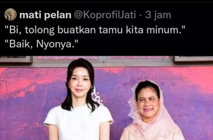 Beredar foto Iriana bersama Kim Kun Hee dengan narasi sebuah percakapan antara asisten rumah tangga dan majikan di media sosial Twitter. Cuitan tersebut diunggah oleh akun @KoprofilJati.