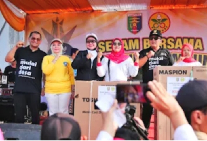Gubernur Lampung didampingi Ketua Umum Perwosi Provinsi Lampung Riana Sari, Pj. Bupati Lampung Utara Aswarodi, bersama ribuan masyarakat yang hadir memadati halaman Stadion Sukung melakukan Senam Lampung Berjaya.