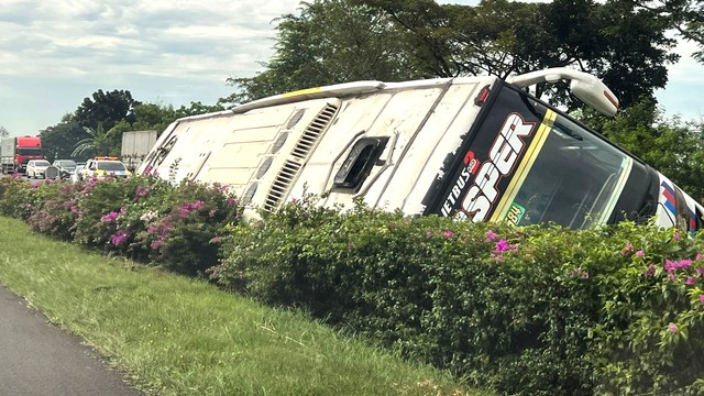 Kecelakaan terjadi tepatnya di KM 212 arah Jakarta. Tampak bus sudah dalam posisi miring, rebah, tersandar di median jalan rerumputan Tol Palikanci.