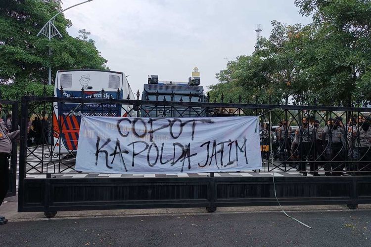 Massa membentangkan spanduk dan poster berisi desakan kepada polisi agar mengusut tuntas tragedi kerusuhan di Stadion Kanjuruhan Malang yang menewaskan 131 orang. Bahkan massa juga meletakkan spanduk bertuliskan ‘Copot Kapolda Jatim’ tepat di pagar pintu masuk gedung Markas Polda Jatim.