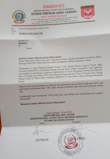 Sebagai informasi, sempat viral di media sosial sejumlah surat edaran permintaan dana THR Idul Fitri 2022 dari ormas ke warga di sekitar Jabodetabek. Adapun surat permintaan dana THR itu di antaranya berasal dari ormas Pemuda Pancasila (PP) Ranting Cengkareng Timur, Jakarta Barat. Menanggapi surat yang viral tersebut dalam dua hari belakangan, polisi memanggil pimpinan Ormas Cengkareng untuk dimintai keterangan.
