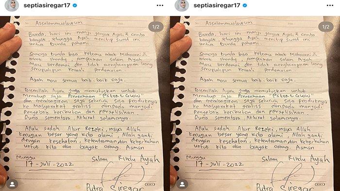 “Assalamualaikum. Bunda, hari ini Manji jenguk Ayah dan cerita banyak. Sehingga Ayah menitipkan surat ini untuk Bunda pahami. Semoga Bunda bisa ketemu Mbak Maharani & Mbak Shandy, sampaikan salam Ayah mau berdamai dan tidak mengharapkan uang serupiah pun kecuali perdamaian. Ayah mau semua baik-baik saja,” tulis Putra Siregar.