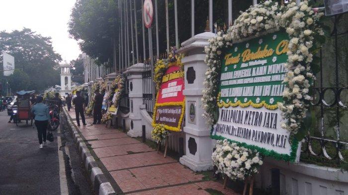 Hingga saat ini, jumlahnya terus bertambah mengelilingi seluruh area Gedung Pakuan. Warga sekitar dan yang melintas pun sempat berhenti sejenak, menyaksikan, dan berfoto di barisan karangan bunga.