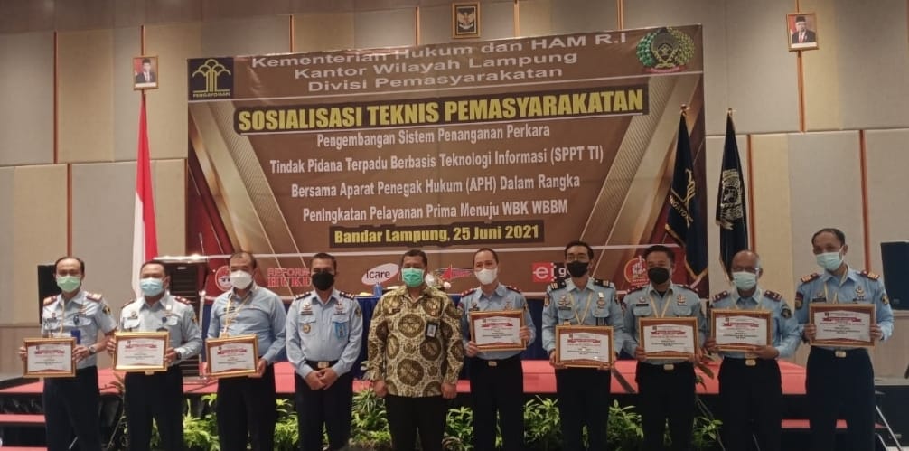 Penghargaan diserahkan langsung oleh Kepala Divisi Pemasyarakatan kepada Karutan disela Acara sosialisasi teknis Pemasyarakatan di Golden Tulip Spring Hill Bandar Lampung, Jum’at (25/06/21).