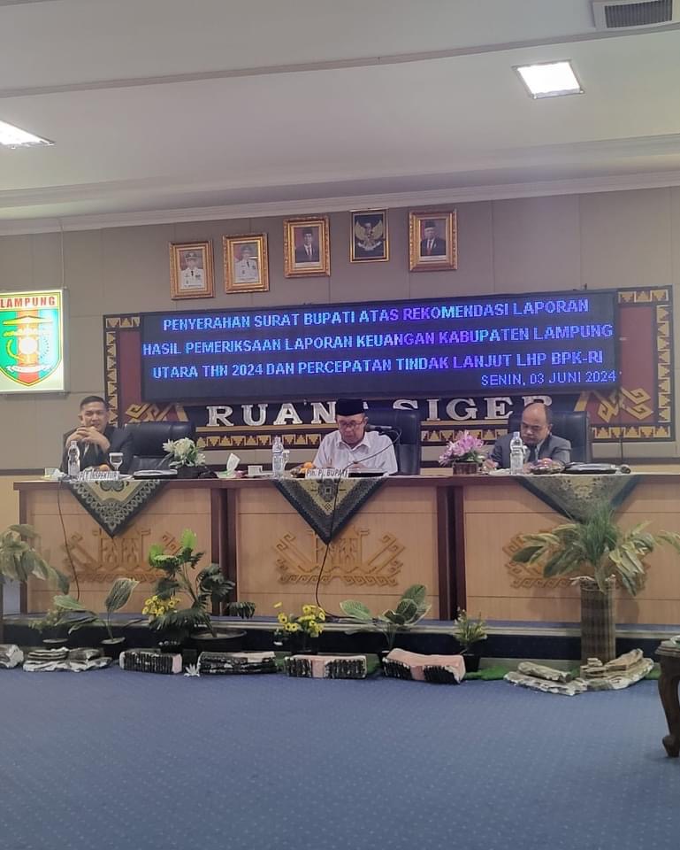 Infogeh.co, Lampung Utara – Sekretaris Daerah (Sekda) Kabupaten Lampung Utara, Drs. Lekok, MM., memimpin rapat penyerahan surat Bupati atas rekomendasi laporan hasil pemeriksaan (LHP) laporan keuangan Kabupaten Lampung Utara tahun 2023 dan percepatan tindak lanjut LHP BPK RI serta kegiatan Monitoring, Control, and Prevention (MCP) dan Satuan Pengawas Internal (SPI) KPK Senin, ( 03/06/2024 ).