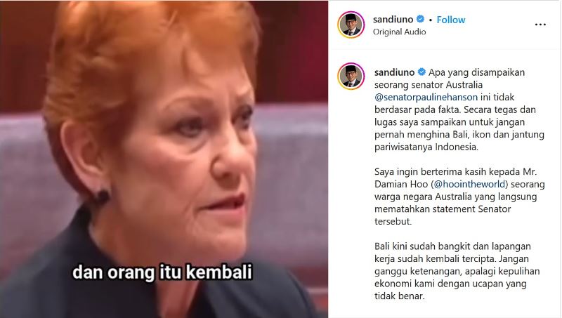 “Apa yang disampaikan seorang senator Australia @senatorpaulinehanson ini tidak berdasar pada fakta. Secara tegas dan lugas saya sampaikan untuk jangan pernah menghina Bali, ikon dan jantung pariwisatanya Indonesia,” tulis Sandiaga.