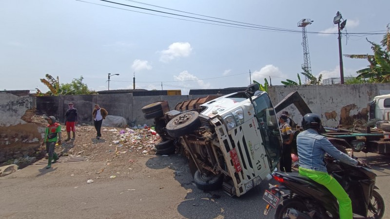 Mulyadi, warga Hanoman, mengatakan kendaraan angkutan sampah berpelat merah itu terguling ke kiri saat hendak menaikan bak sampah ke atas truk.