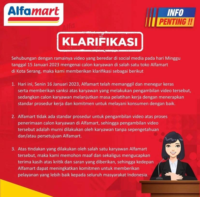 infogeh.co, Jakarta – Sebuah video viral di media sosial memperlihatkan seorang perempuan di toko Alfamart menangis meminta maaf karena tidak memberi salam pada pelanggan yang masuk. Dari narasi yang beredar perempuan itu merupakan pegawai magang Alfamart.