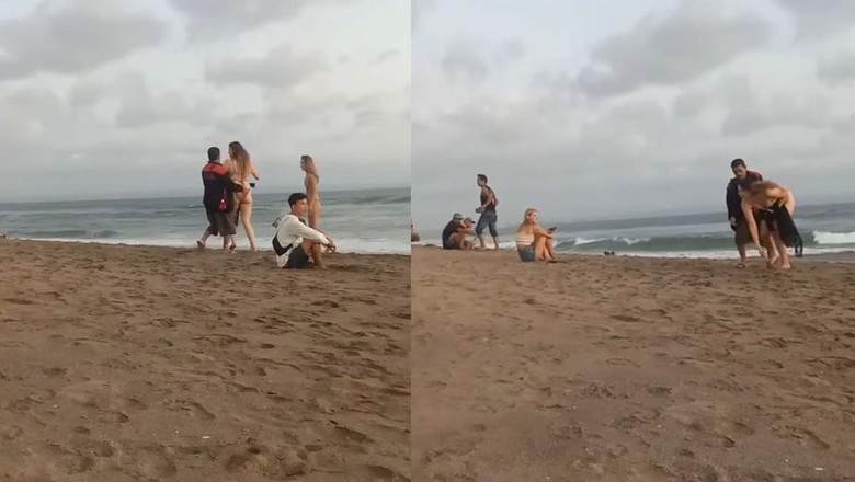 Video yang viral itu memperlihatkan turis bule yang memakai bikini berebut HP dengan bapak-bapak berjaket hitam merah. Salah satu pengunjung pantai sempat melerai aksi keduanya namun tidak berhasil.