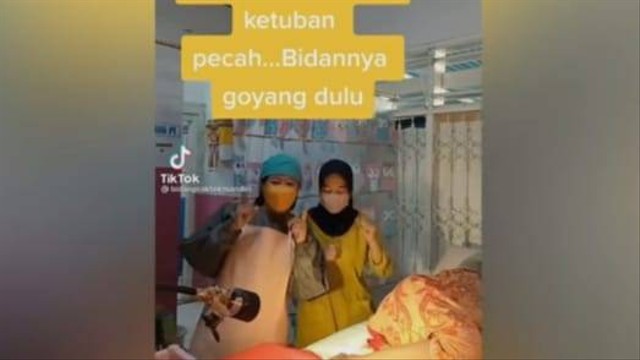 Dalam tayangan video itu, terlihat seorang ibu hamil berbaring miring dan didampingi suaminya. Keterangan video menyebutkan kalau ibu hamil itu menunggu pecah ketuban. Oleh ketiga bidan, kondisi ini dijadikan konten TikTok.