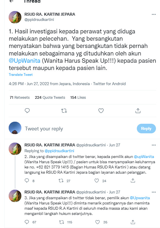 “Jika yang disampaikan di Twitter benar, kepada pemilik akun Twitter @UpWanita (Wanita Harus Speak Up!!!) / pasien untuk bisa menyampaikan keluhannya ke nomor +62 821 3779 1415 (Bagian Humas RSUD RA Kartini ) atau datang langsung ke RSUD RA Kartini Jepara bagian layanan aduan pelanggan,” kata dia.