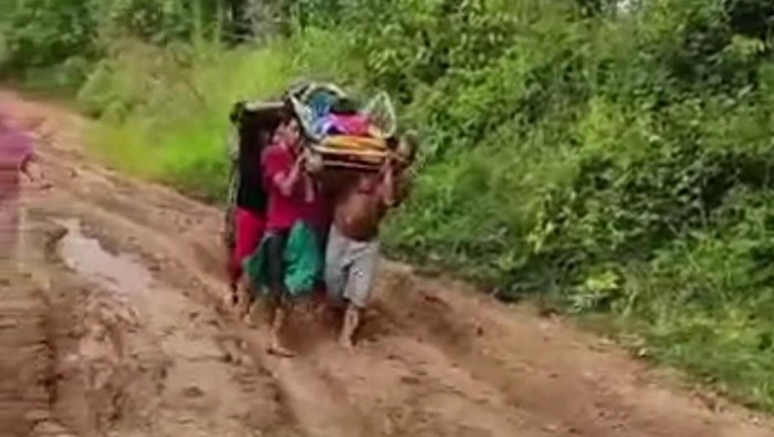Dalam video itu terlihat, warga menggotong Rusmina dengan menggunakan tandu darurat yang terbuat dari kayu. Mereka pun berjalan di atas tanah merah yang berlumpur dan sulit dilewati oleh kendaraan.