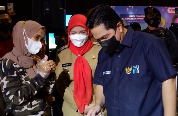 infogeh.co, Bandar Lampung – Walikota Bandar Lampung Eva Dwiana mendampingi Menteri BUMN RI Erick Thohir meninjau pelaksanaan operasi pasar murah PTPN VII di Stadion Sumpah Pemuda, Way Halim, Bandar Lampung, Senin (31/1/2022).