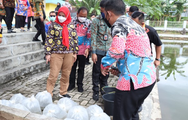 infogeh.co, Bandar Lampung – Walikota Bandar Lampung beserta jajaran menebar 10.000 bibit ikan nila dan ikan emas di Embung Korpri Sukarame Bandar Lampung, Kamis (10/2/2022).