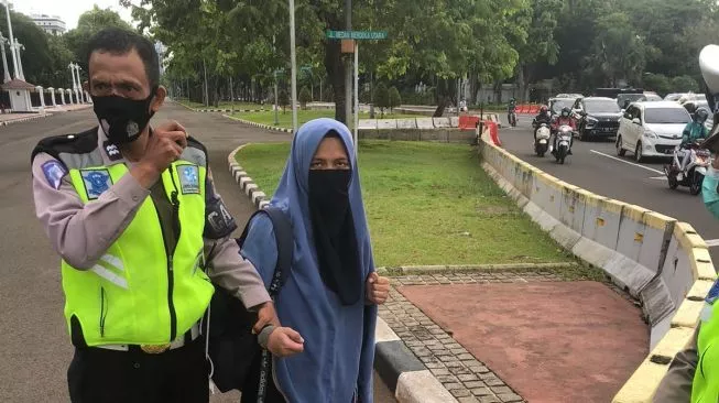 Perempuan tersebut berdiri di dekat pos utama Paspampres di depan Istana Merdeka yang ada ada di dekat lampu pengatur lalu lintas.
